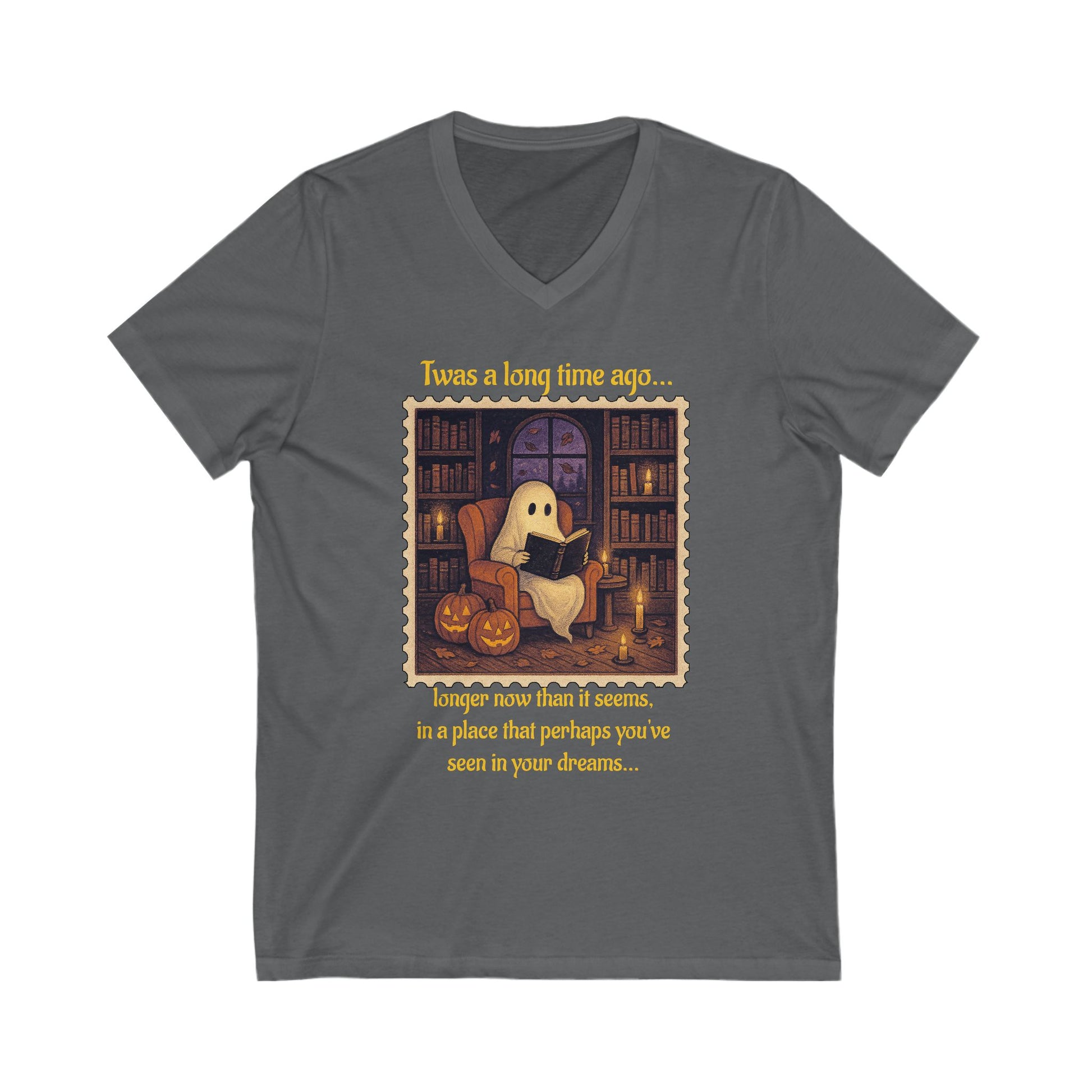 Introducing the perfect Unisex Jersey Short Sleeve V-Neck Tee that blends comfort with style! This tee captures a whimsical vibe, reminiscent of cozy evenings spent in the company of ghosts and books. Ideal for casual outings or relaxing at home, it effortlessly fits into any wardrobe. Whether you're a literature lover or a fan of playful designs, this tee is perfect for you. Great for gifting on Halloween, literary-themed celebrations, or cozy get-togethers, it adds a touch of fun and nostalgia to your life!